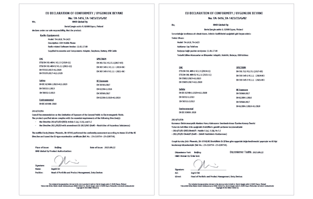 AB'de üretici ve/veya ithalatçı: HMD Global Oy, Bertel Jungin aukio 9, 02600 Espoo, Finlandiya.